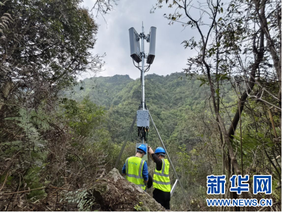 “数字先锋队”队员在陡峭山间进行基站选址勘测。新华网发