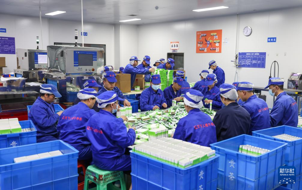 5月14日,工人在贵州省江口县贵茶产业园抹茶生产车间包装抹茶产品。新华社记者 吕帅 摄