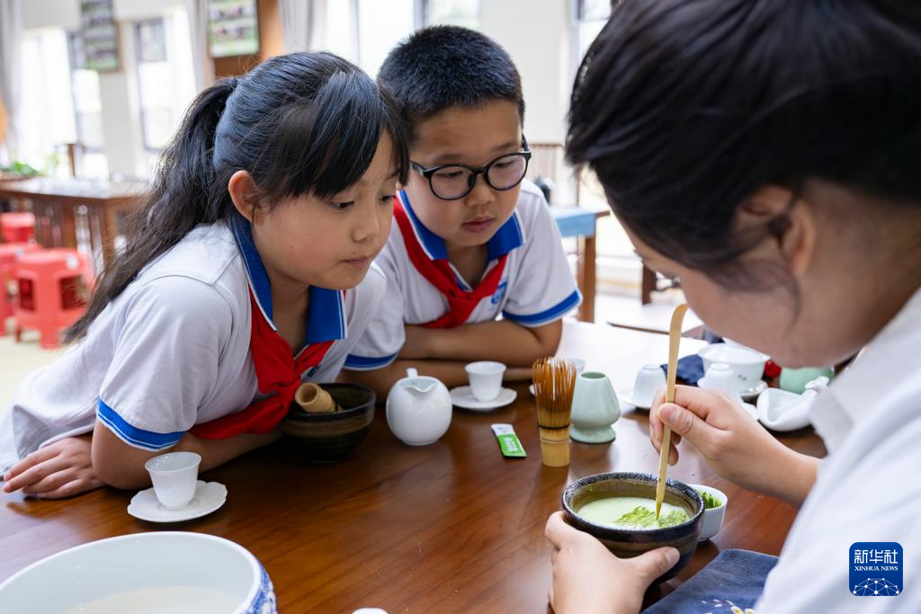 5月14日,学生在贵州省江口县贵茶产业园茶室参加研学,了解抹茶茶饮制作。新华社记者 杨文斌 摄