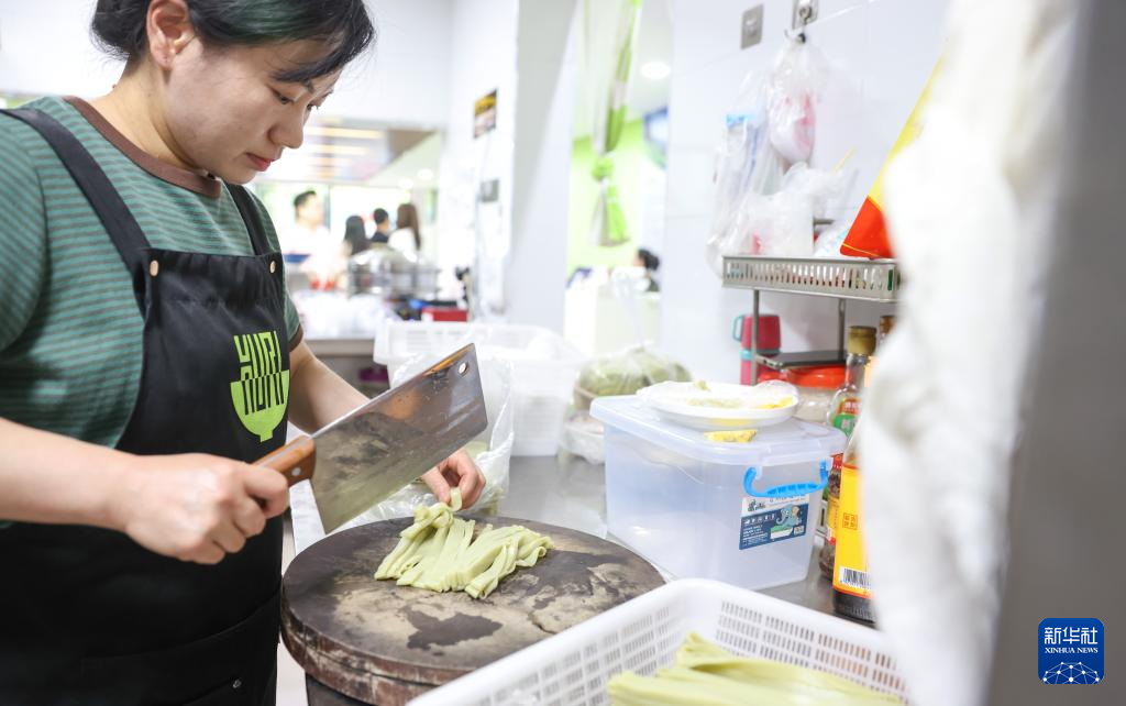 5月14日,工作人员在贵州省江口县一家抹茶食品餐厅内制作抹茶面皮。新华社记者 吕帅 摄