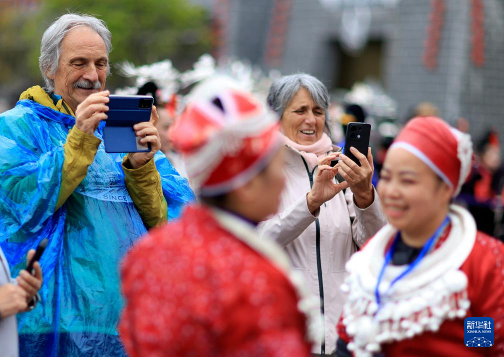 2025年4月12日,外国游客在贵州省黔东南苗族侗族自治州台江县举行的姊妹节庆祝活动上拍摄。新华社记者 刘续 摄