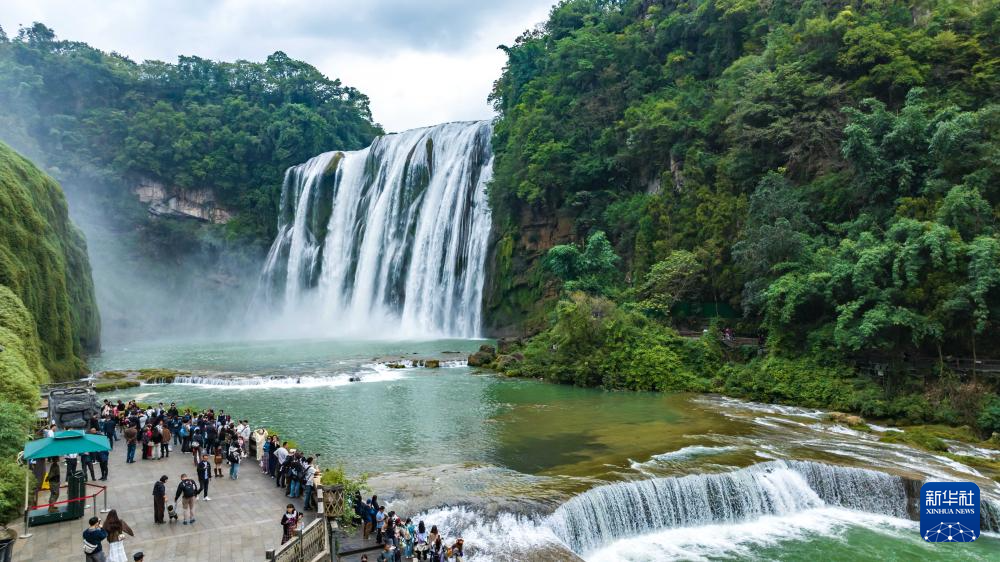 2024年10月7日,游客在贵州省安顺市黄果树瀑布景区游览(无人机照片)。新华社发(陈熙摄)