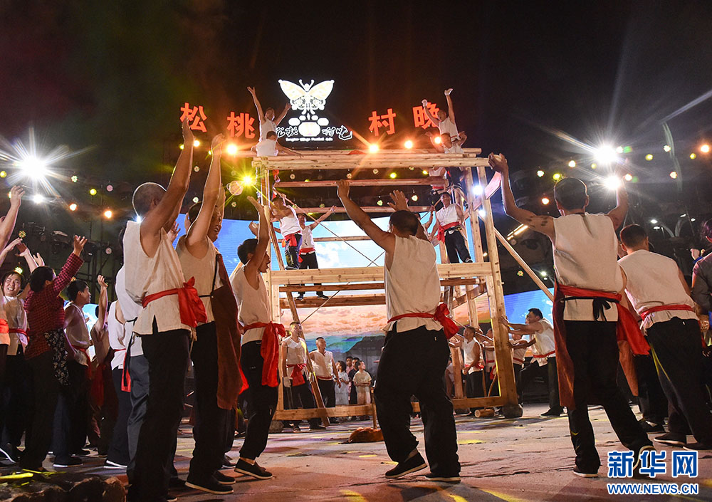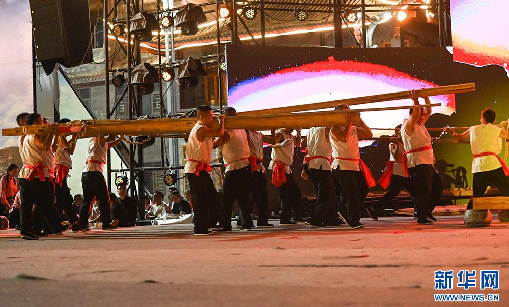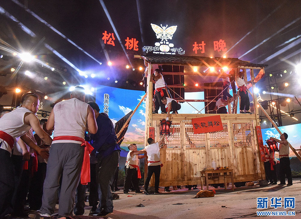 6月14日,在“松桃村晚”现场,九江街道村民抬着木料入场“立新房”。新华网发(谢慧芳 摄)