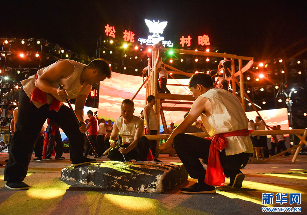 6月14日,在“松桃村晚”现场,九江街道村民抬着石料入场“立新房”。新华网发(谢慧芳 摄)