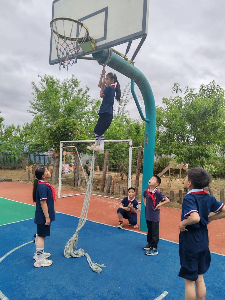 田字格兴隆实验小学的学生在篮球架下攀爬