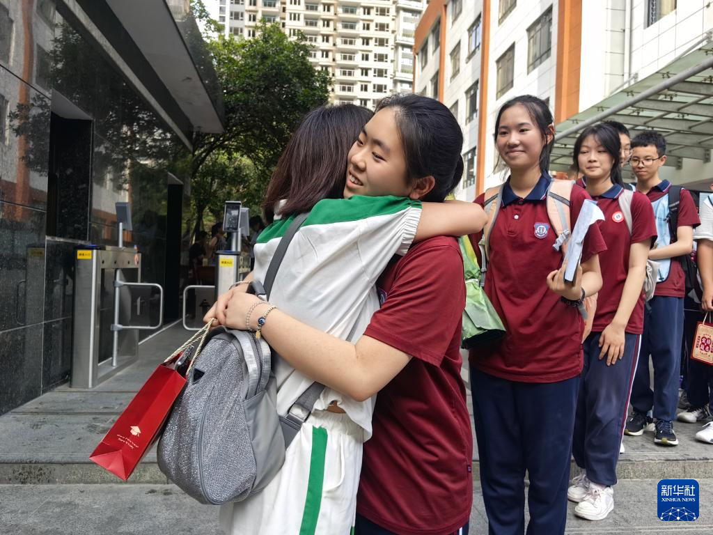 6月17日下午,贵阳市第十七中学的教师在送考活动上拥抱学生。(受访者供图)