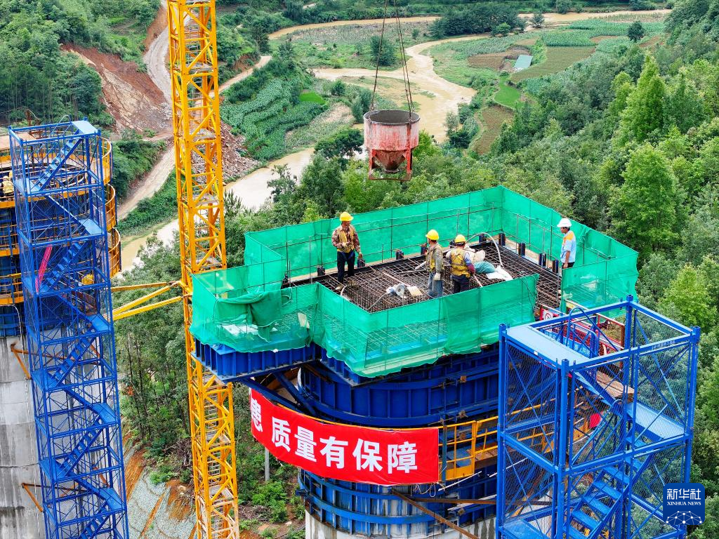 7月9日,工作人员对桥墩进行最后的混凝土浇筑(无人机照片)。新华社记者 刘续 摄