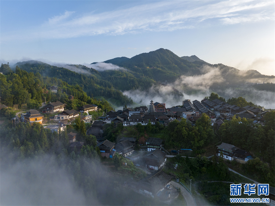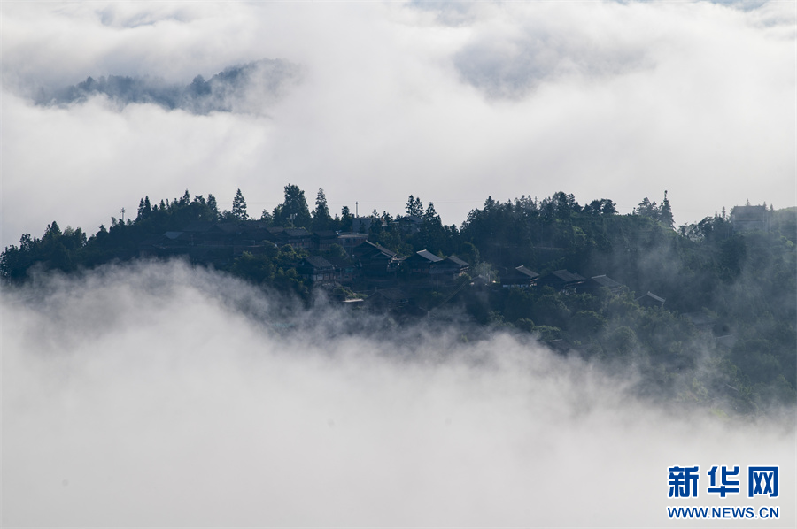 盛夏时节,贵州省黔东南苗族侗族自治州从江县高增乡天鹅山出现云海景观,侗寨民居、田园、山林、公路相互映衬,宛若仙境。
