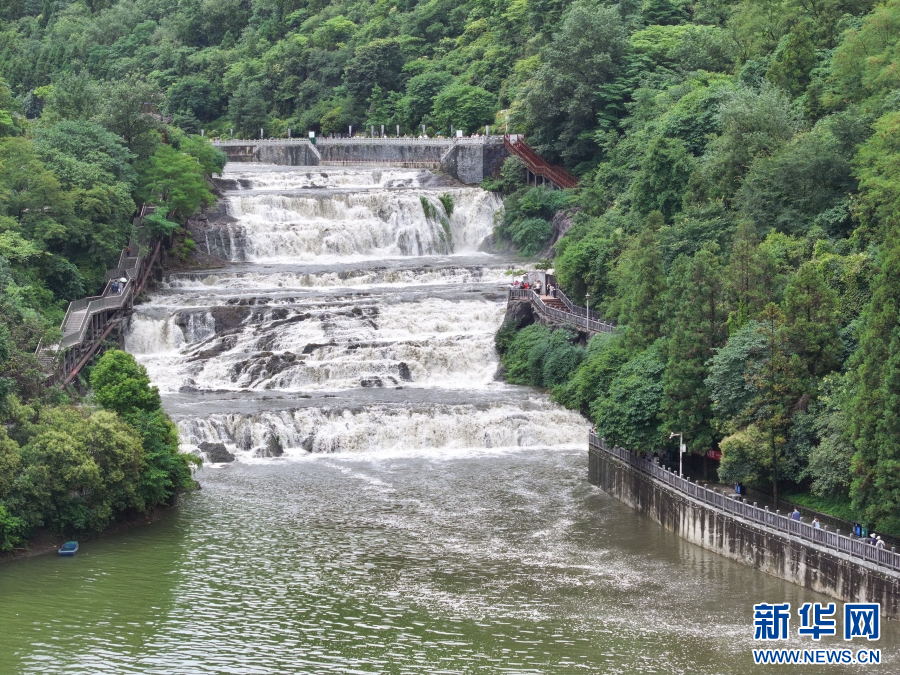 近日,受持续降雨影响,贵州省毕节市七星关区响水滩瀑布水量充沛,河水从滩上倾泻而下,气势磅礴,吸引众多市民和游客前来观赏。响水滩瀑布群由响水滩、龙潭等部分构成,是全国少有的城市市区天然大瀑布。