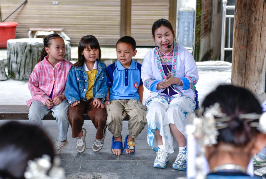 4月22日,杨想妮(右一)在贵州黎平县肇兴镇厦格侗寨教孩子们唱侗歌。新华社记者 杨文斌 摄