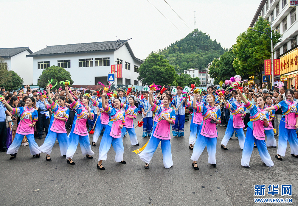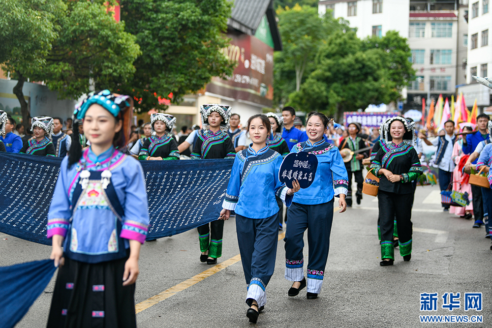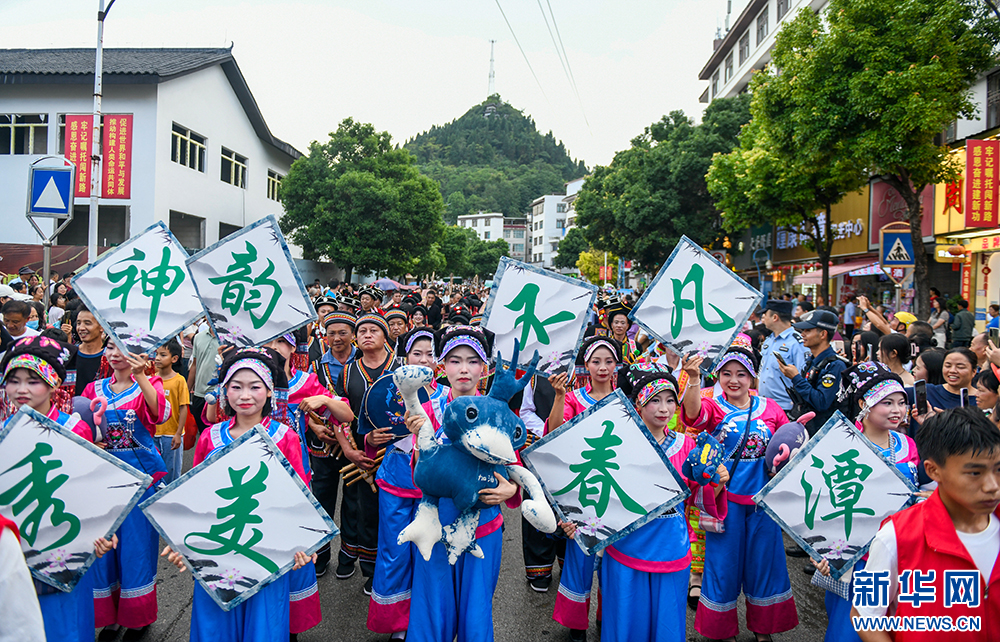 少数民族群众在贵州省黔西南州安龙县巡游展演。