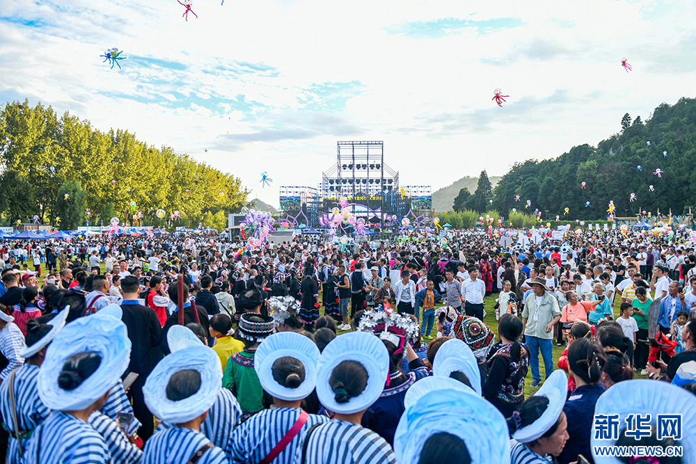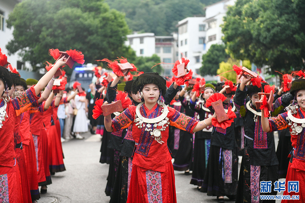 7月25日,少数民族群众在贵州省黔西南州安龙县巡游展演。新华网发(刘朝富 摄)