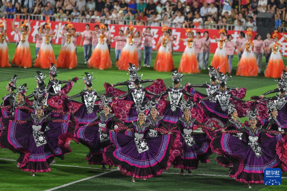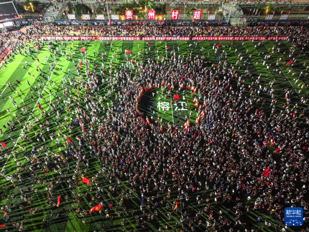 7月26日,人们在贵州“村超”球场表演节目(无人机照片)。新华社记者 杨文斌 摄