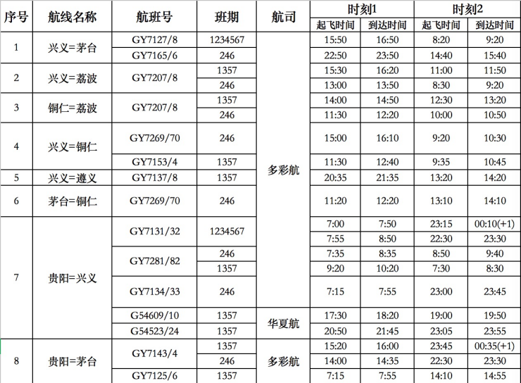 暑运期间兴义机场新增及加密航线航班时刻(具体以航空公司发布为准)