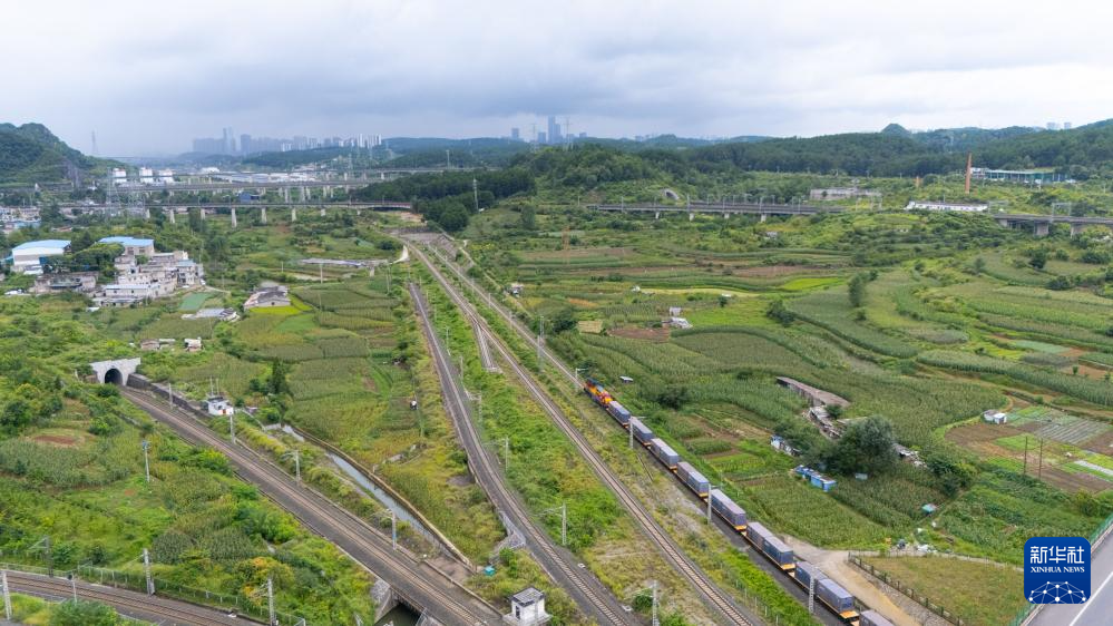 8月19日,贵州首趟多式联运“一单制”班列驶出贵阳国际陆港都拉营站(无人机照片)。新华社发(邵健摄)