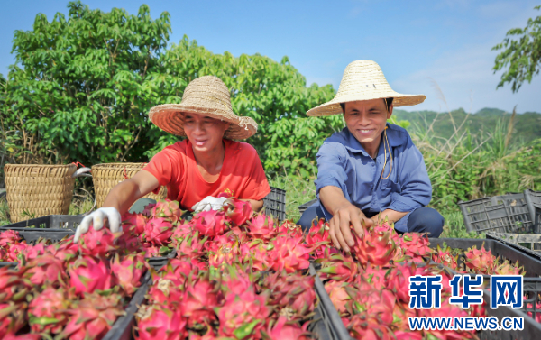 新华网贵阳9月15日电(卢志佳)时下,“中国火龙果之乡”贵州省罗甸县的广袤山地一片“火红”,全县3万多亩火龙果正陆续挂果,各个种植基地里,果农忙着向全国的消费者输送来自山乡的甜蜜味道。