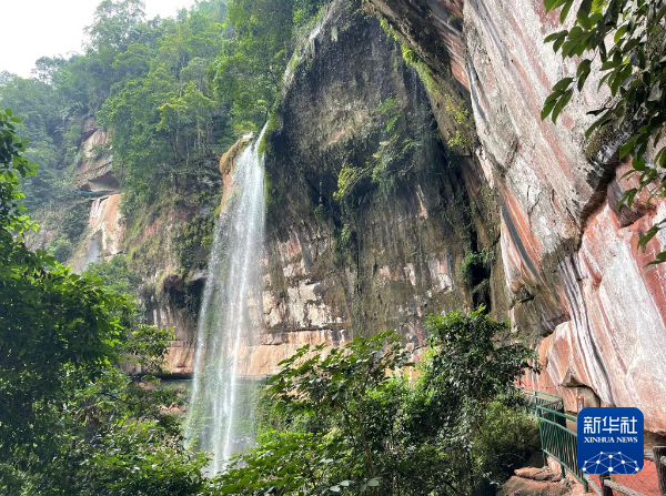 “听着瀑布声喝咖啡,抬头就是丹霞崖壁,这种‘自然与休闲’的结合太惬意了。”来自贵阳的游客周佳佳边拍视频边说,她想让更多人看到这里的生态之美。