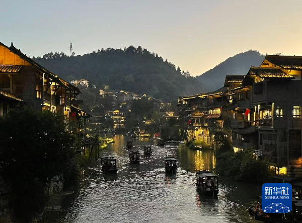 新华社贵阳10月7日电(记者骆飞)当金秋的晚霞映照着黔北连绵的群山,地处贵州乌江流域的乌江寨被“描上”点点金光。晚霞渐褪,夜幕中的寨子,灯笼、夜景灯次第亮起,映着潺潺流水与吊脚楼飞檐。