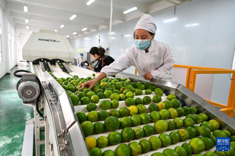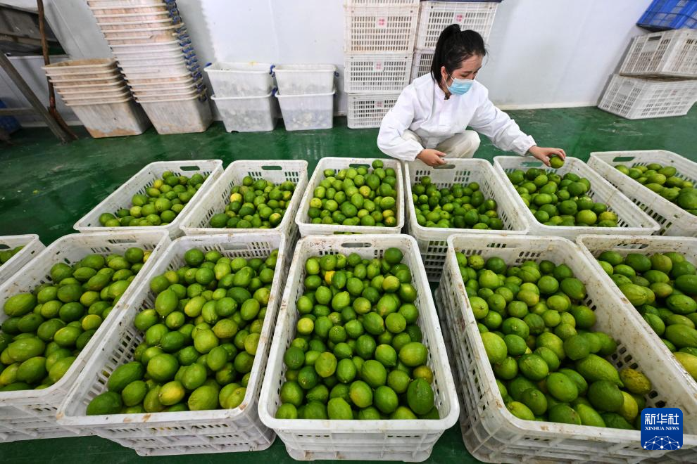 10月16日,工人在望谟县蔗香镇青柠檬现代产业园的生产车间分拣柠檬。新华社记者 杨文斌 摄