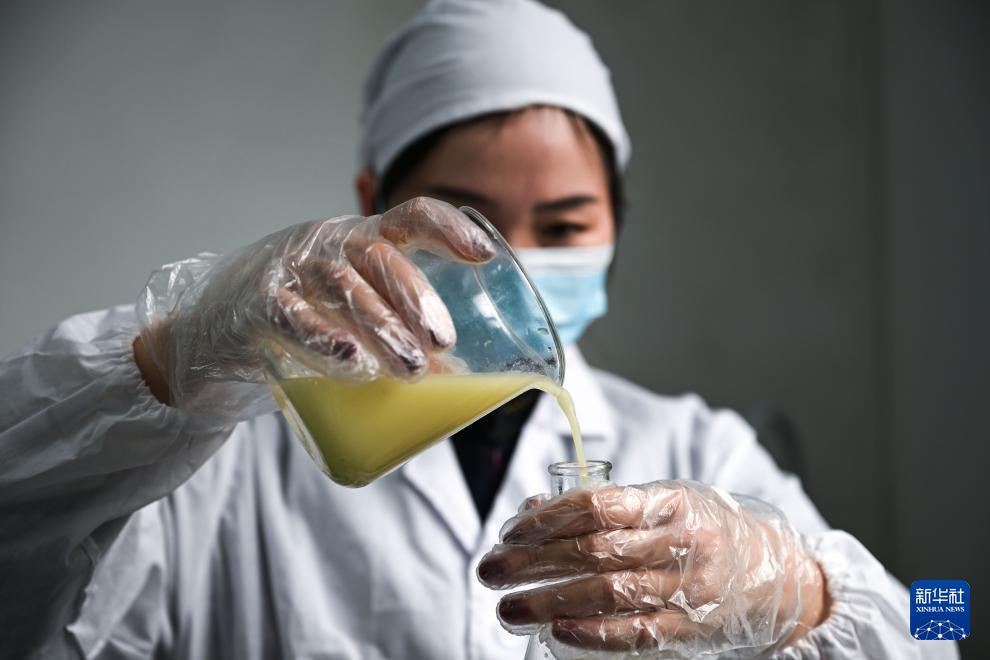 10月16日,在望谟县蔗香镇青柠檬现代产业园,工作人员对柠檬原汁进行初步检测。新华社记者 杨文斌 摄