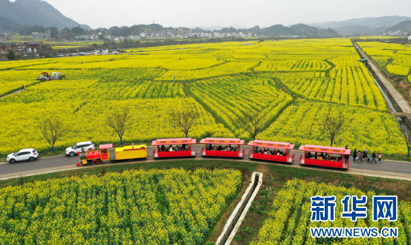 在贵州省贵定县盘江镇“金海雪山”景区,游客乘坐观光小火车观赏油菜花(无人机照片)。新华社记者 杨文斌 摄