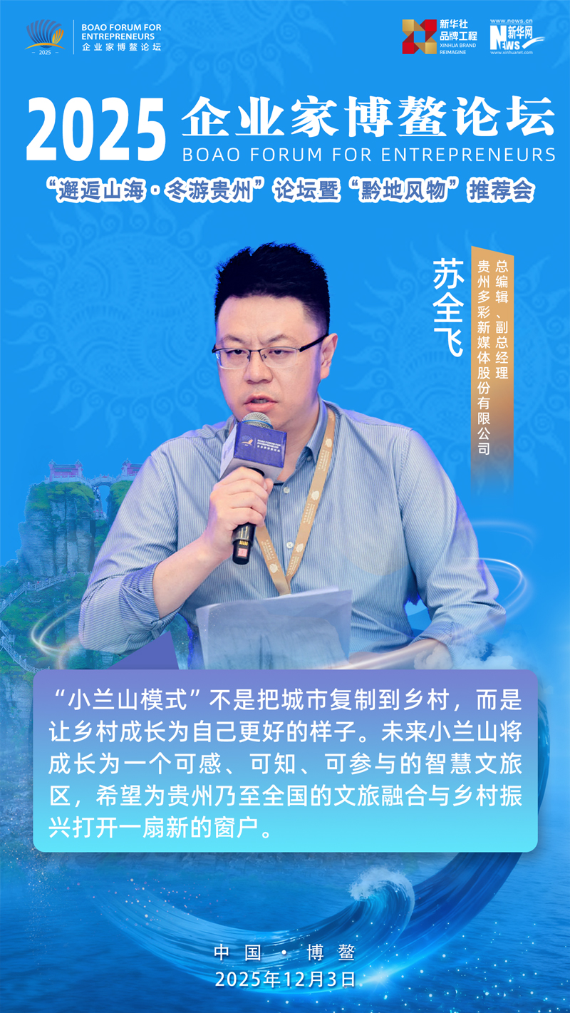 12月3日,由贵州省委宣传部指导,新华社品牌工作办公室、新华网、新华社贵州分社主办的2025企业家博鳌论坛之“邂逅山海·冬游贵州”论坛暨“黔地风物”推介会在海南博鳌举办。论坛现场,贵州多彩新媒体股份有限公司总编辑、副总经理苏全飞以贵阳市观山湖区“小兰山数字文化产业生态村落”为例,共同探讨数字文化经济驱动乡村全面振兴的新路径。