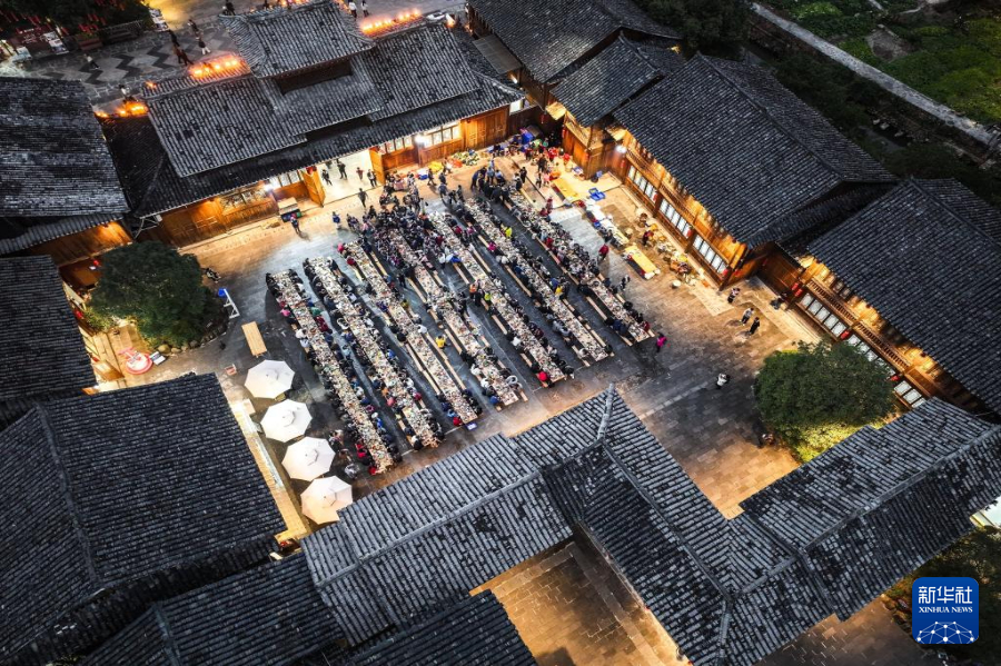 在贵州省黎平县肇兴侗寨,侗族同胞与来宾在侗年活动中共享长桌宴(12月20日摄,无人机照片)。新华社记者 杨文斌 摄