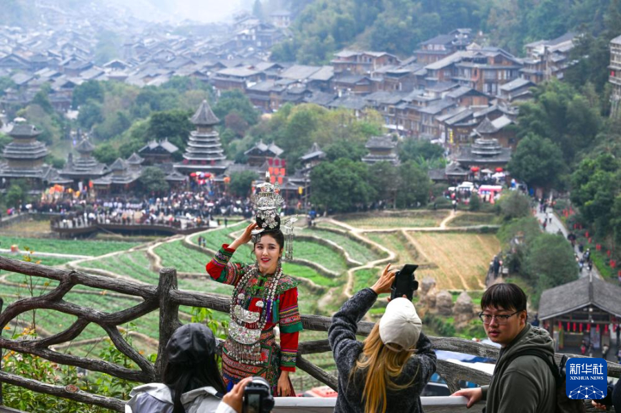 游客在贵州省黎平县肇兴侗寨观景台留影(12月20日摄)。新华社记者 杨文斌 摄