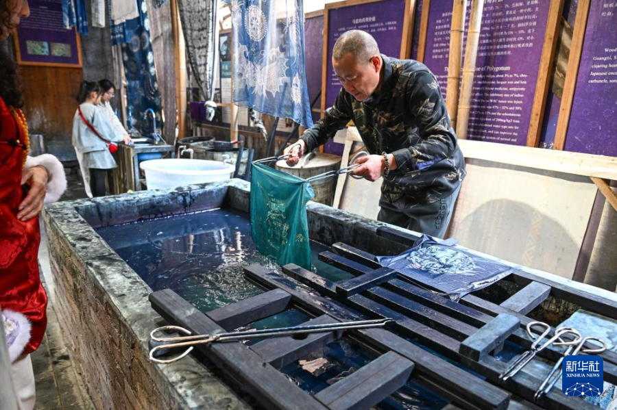 游客在贵州省黎平县肇兴侗寨侗品源传统工艺农民专业合作社里体验蜡染技艺(12月20日摄)。新华社记者 杨文斌 摄