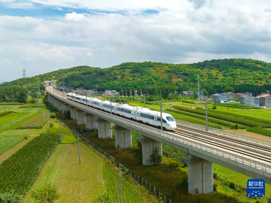 2022年6月20日,郑渝高铁实现全线贯通运营。这是列车行驶在郑渝高铁湖北省襄阳市东津新区境内(无人机照片)。新华社发(杨东摄)