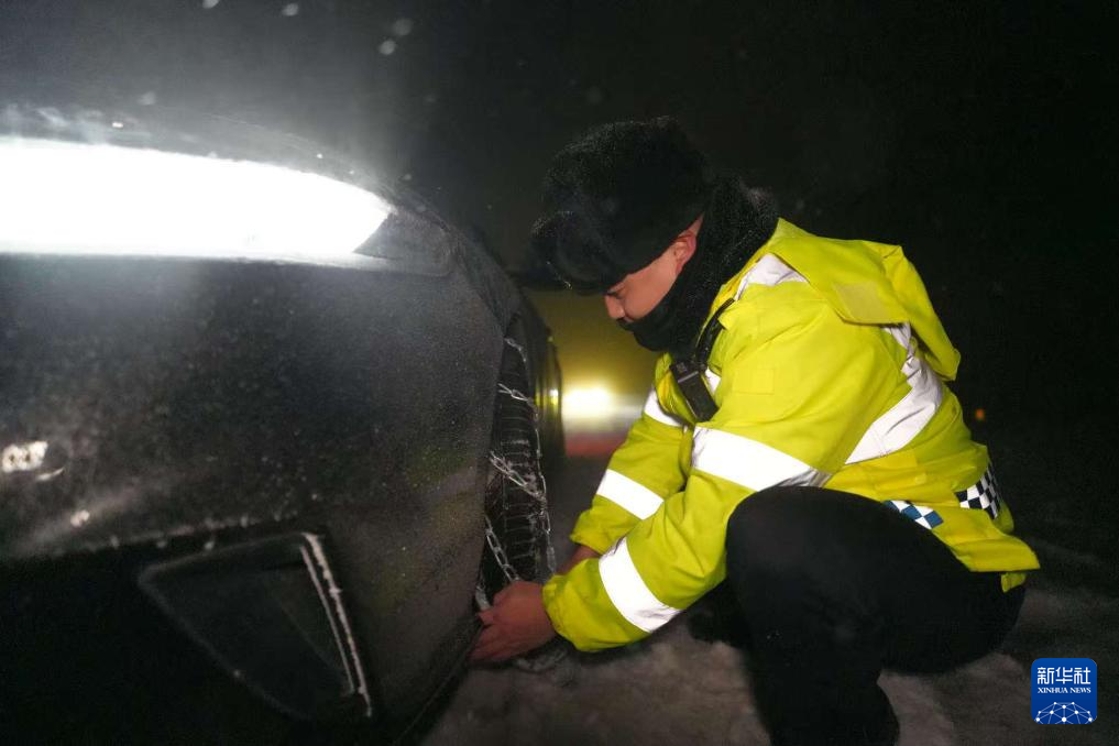 1月20日,巴东县公安局绿葱坡派出所副所长甘方尧正在为滞留车辆安装防滑链。新华社发(焦国斌摄)