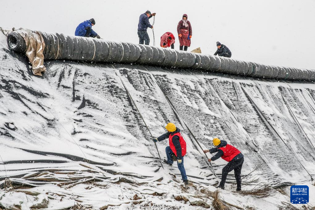1月19日,在河南省焦作市博爱源蔬菜专业合作社,辖区供电职工帮助菜农对蔬菜大棚保暖棉被进行维护。新华社发(程全摄)