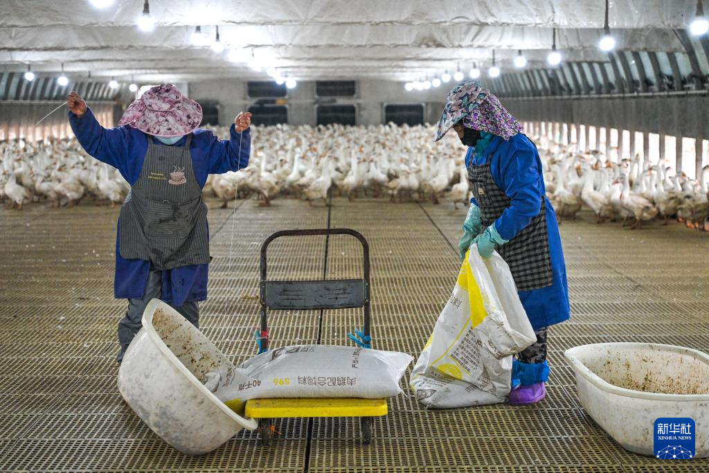 工人在贵州省锦屏县新化乡欧阳村的生态鹅育雏基地给种鹅投食(2026年1月21日摄)。新华社记者 杨文斌 摄