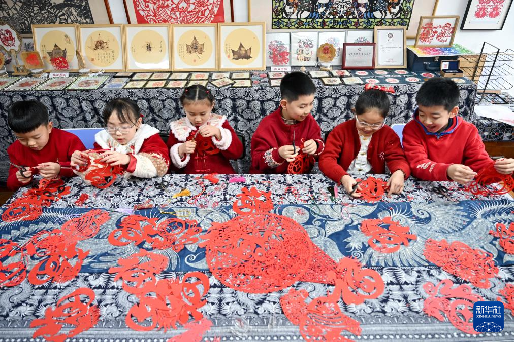 2月3日,在贵州省贵阳市省府路小学,学生在老师的指导下创作马年主题剪纸作品。