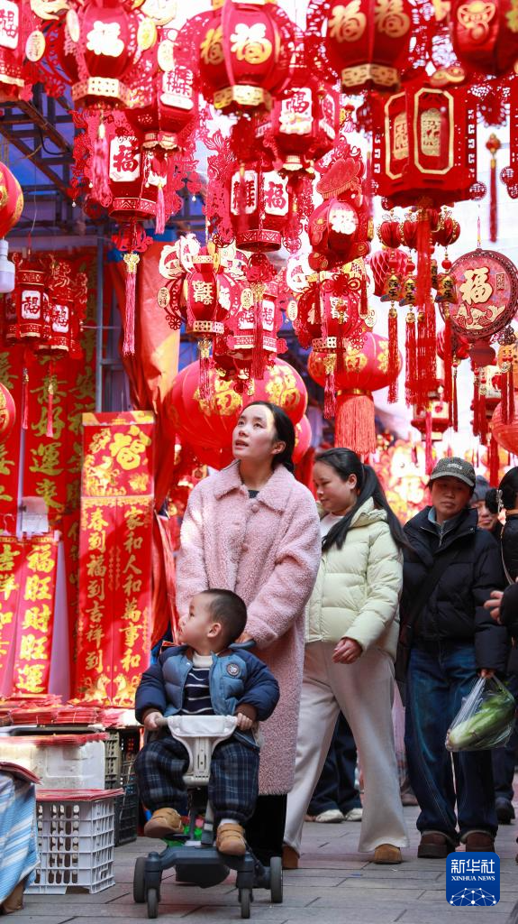 2月11日,家长带着孩子在贵州省都匀市年画市场选购春节饰品。