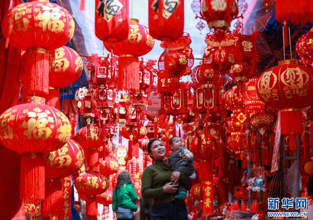2月13日,人们在贵州省铜仁市玉屏侗族自治县年货市场选购新年饰品。新华社发(胡攀学摄)