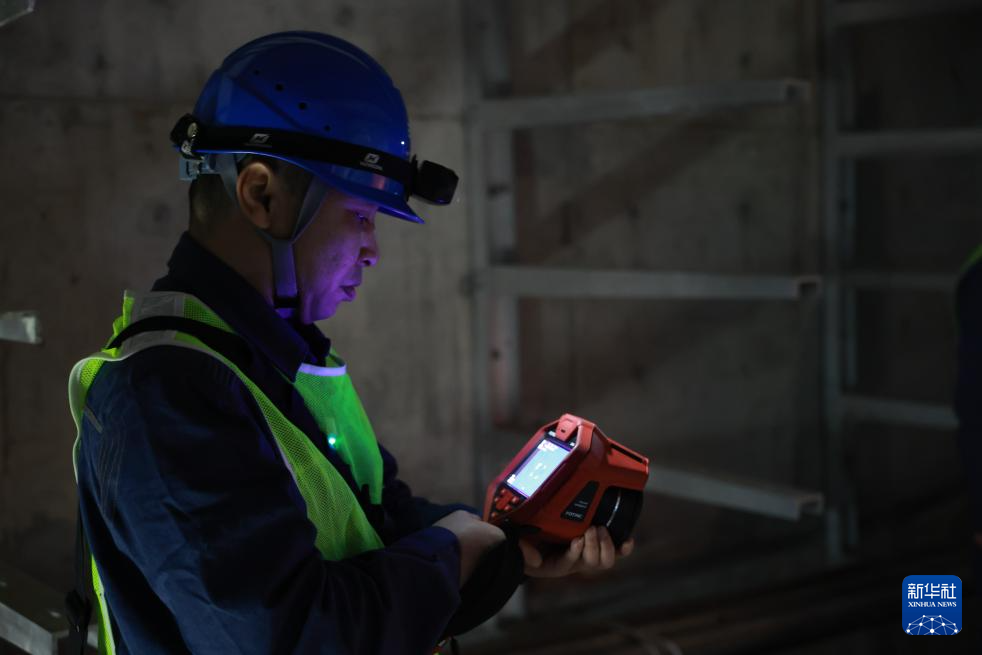 头灯的光柱划破幽暗——眼前是深邃的混凝土管廊,两侧支架上盘踞着碗口粗的高压电缆,如同沉睡的黑龙,在银色金属桥架的托举下向深处延伸。面对幽深的管廊,罗羽举起气体检测仪,对管廊进行空气检测。