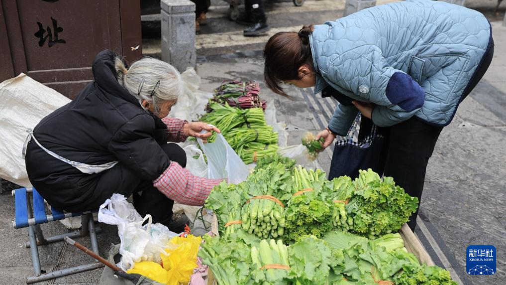 2月13日,一名市民(右)在挑选左福秀乘坐252路惠农专线公交车带来的新鲜蔬菜。新华社记者 刘勤兵 摄
