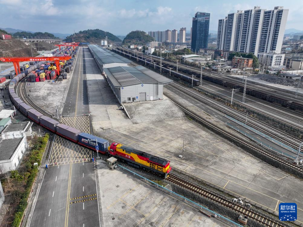 2月15日,一列满载集装箱的中欧班列驶离贵阳国际陆港都拉营站(无人机照片)。新华社发(袁福洪 摄)