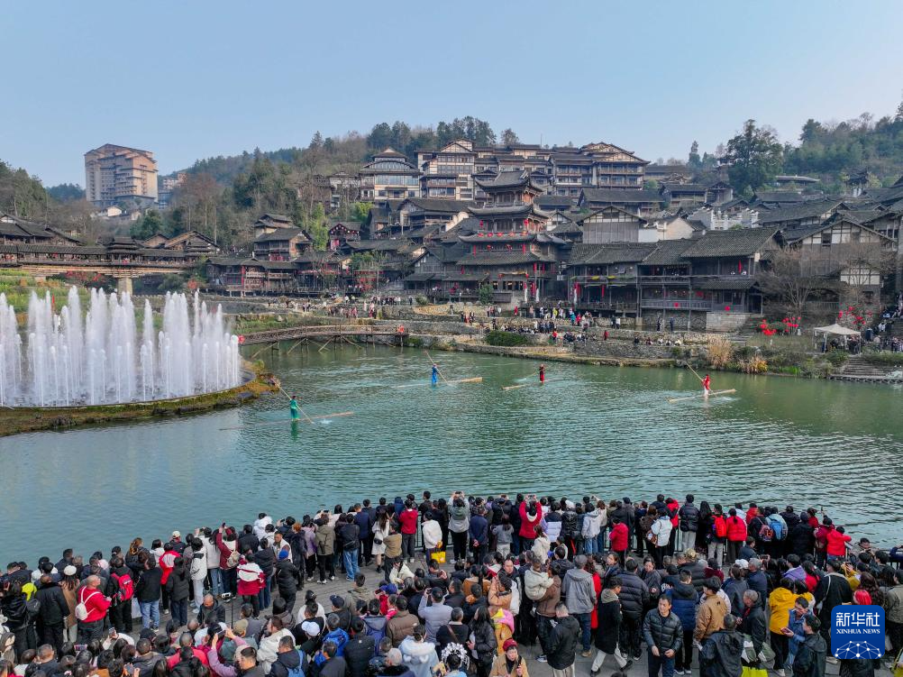 2月17日,游客在贵州省遵义市乌江寨景区观看独竹漂表演(无人机照片)。新华社发(袁福洪 摄)