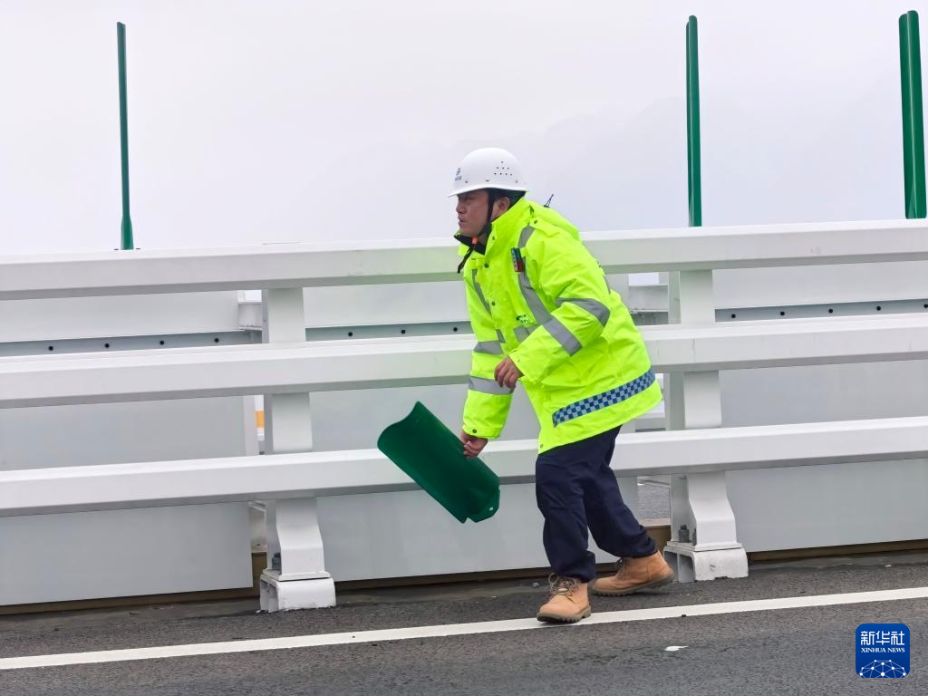 李联宇正在花江峡谷大桥上捡回路中央掉落的防眩板。新华社记者周芷若 摄