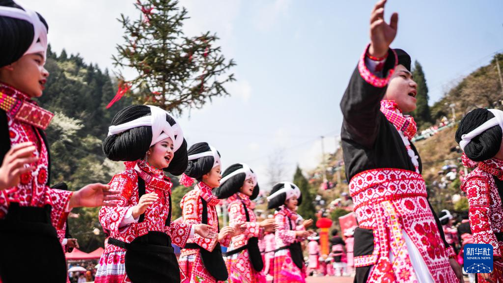 2月26日,在贵州省六盘水市六枝特区梭戛苗族彝族回族乡高兴村跳花场,苗族群众在演唱歌曲。新华社记者 陶亮 摄