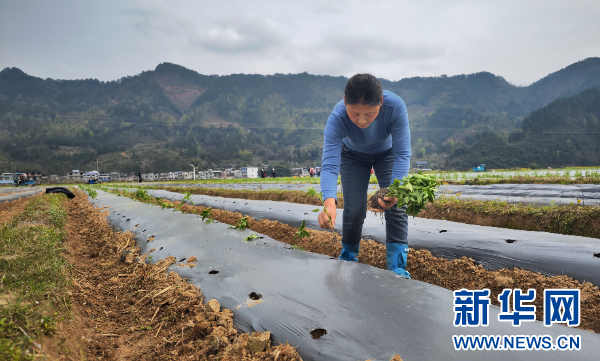 3月6日,新场村村民刘红梅在基地移栽辣椒苗。新华网 卢志佳 摄