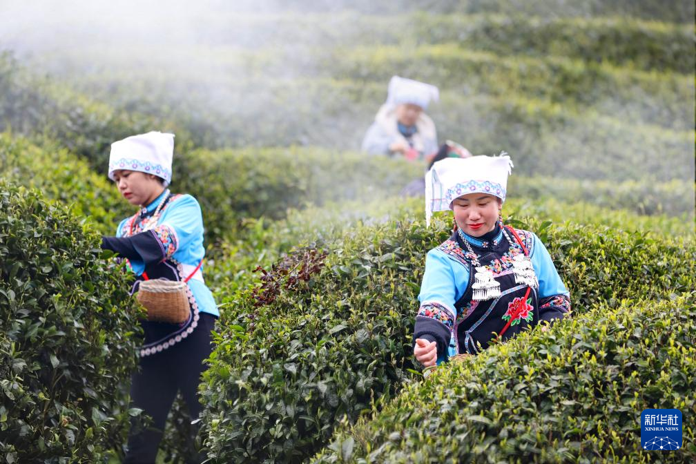 村民们在螺蛳壳茶山采茶。新华社发(冯小东摄)