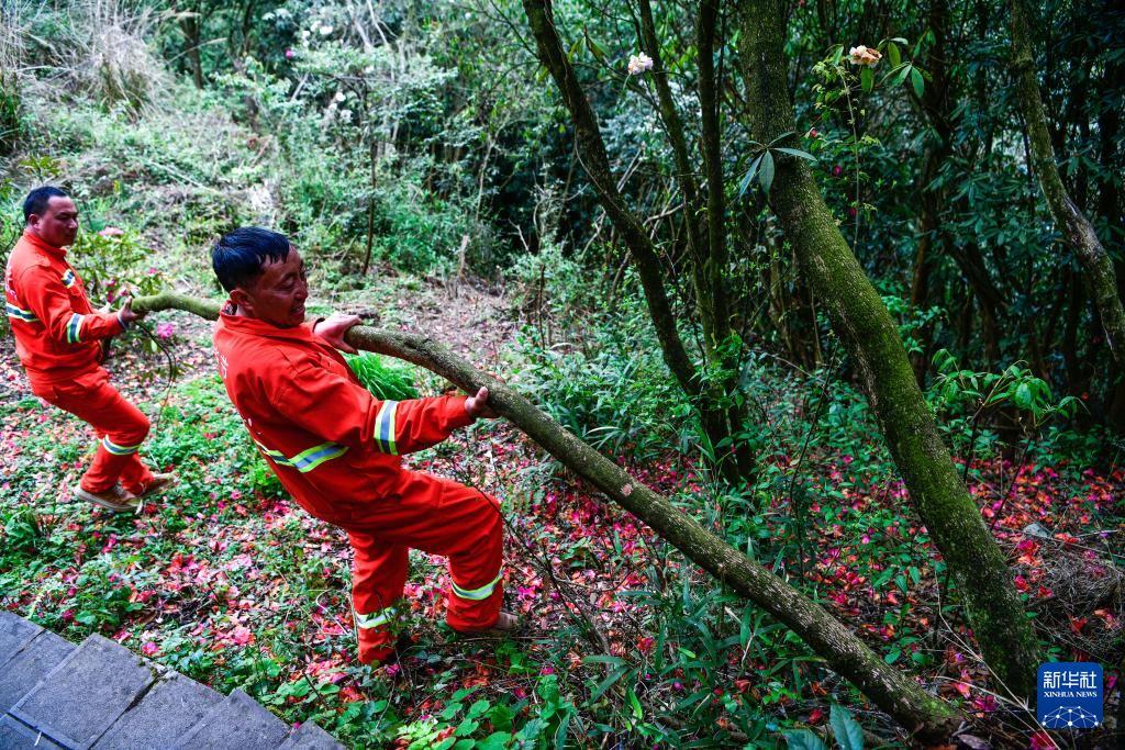 在贵州百里杜鹃管理区金坡景区,森林防火队员们在巡逻途中清理一棵倒伏的杜鹃树(4月2日摄)。新华社记者 杨文斌 摄