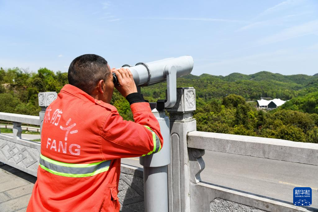 森林防火队员在贵州百里杜鹃管理区金坡景区利用望远镜查看林区情况(2020年4月28日摄)。新华社发(周燕林 摄)