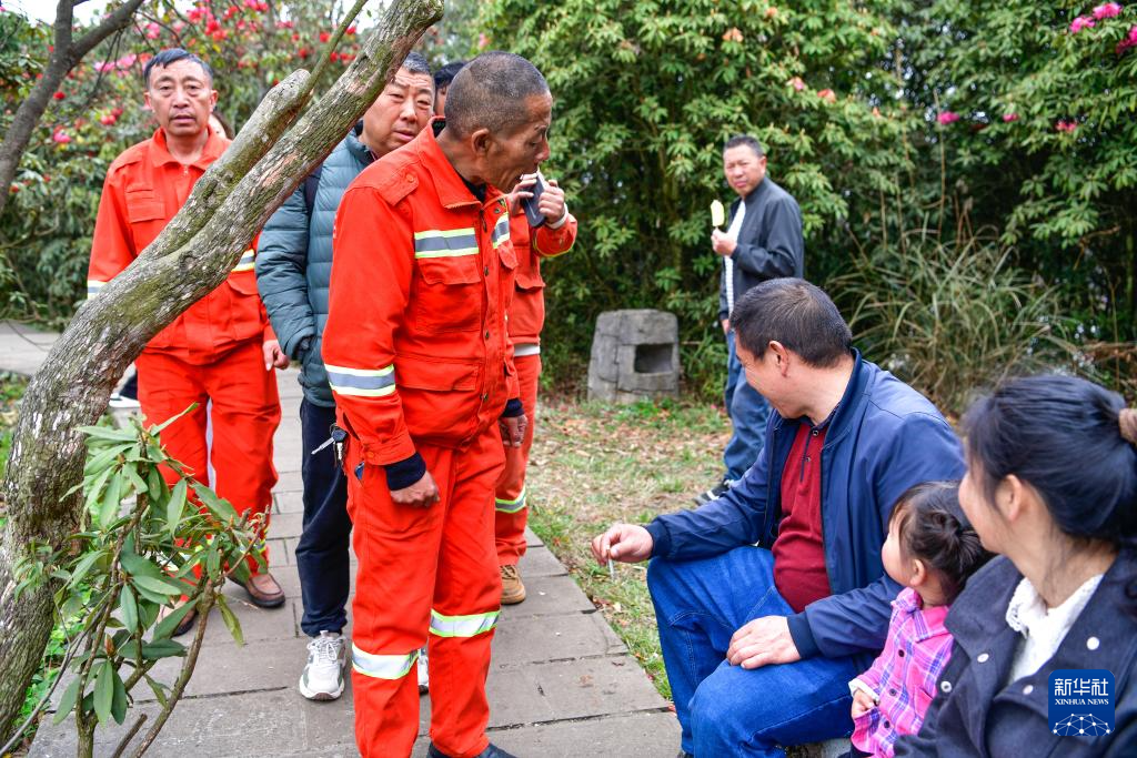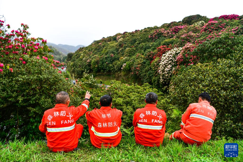 森林防火队员们在贵州百里杜鹃管理区金坡景区巡逻途中休息(4月2日摄)。新华社记者 杨文斌 摄