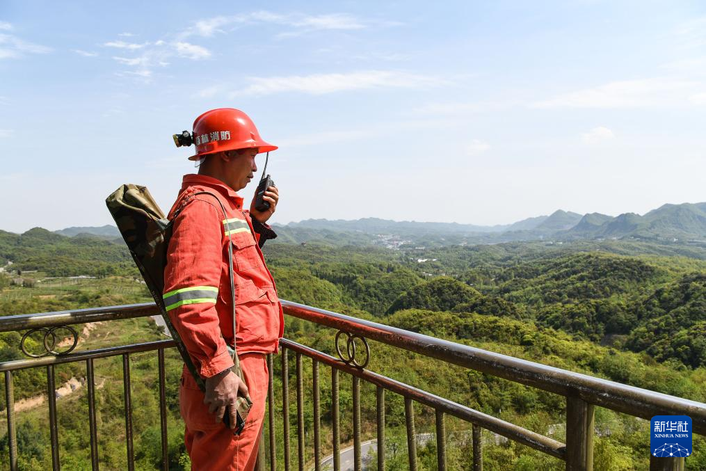 森林防火队员在贵州百里杜鹃管理区金坡景区的一处瞭望塔上查看林区情况(2020年4月28日摄)。新华社发(周燕林 摄)