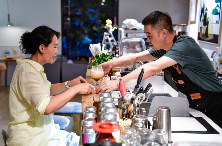 “黑石咖啡”主理人雷鸣(右)为顾客介绍一款创意咖啡。(杨文斌 摄)