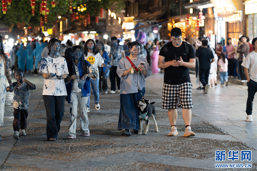 4月18日,在贵州省黎平县肇兴侗寨,参与“抹花脸”活动的游客在拍照。新华网发(龙建睿 摄)